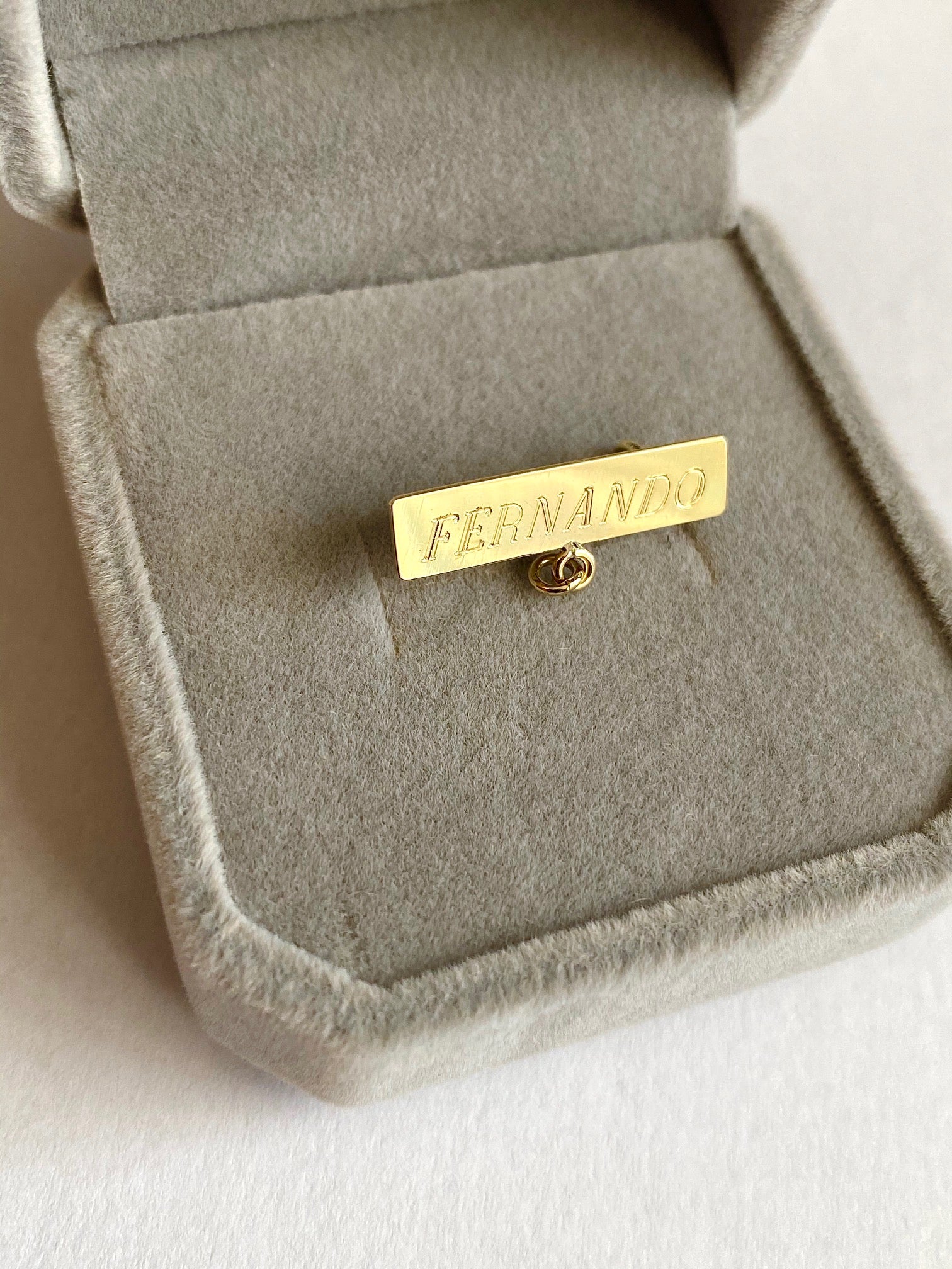 Descubre nuestra exclusiva colección de imperdibles tipo plaquita grabado, personalizados con el nombre que tú elijas en Plata bañada en Oro.